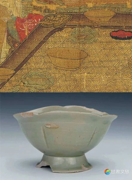 古画和现实中的“秘色瓷”茶盏对比。唐人《宫乐图》(局部);浙江上林湖后司岙窑址出土